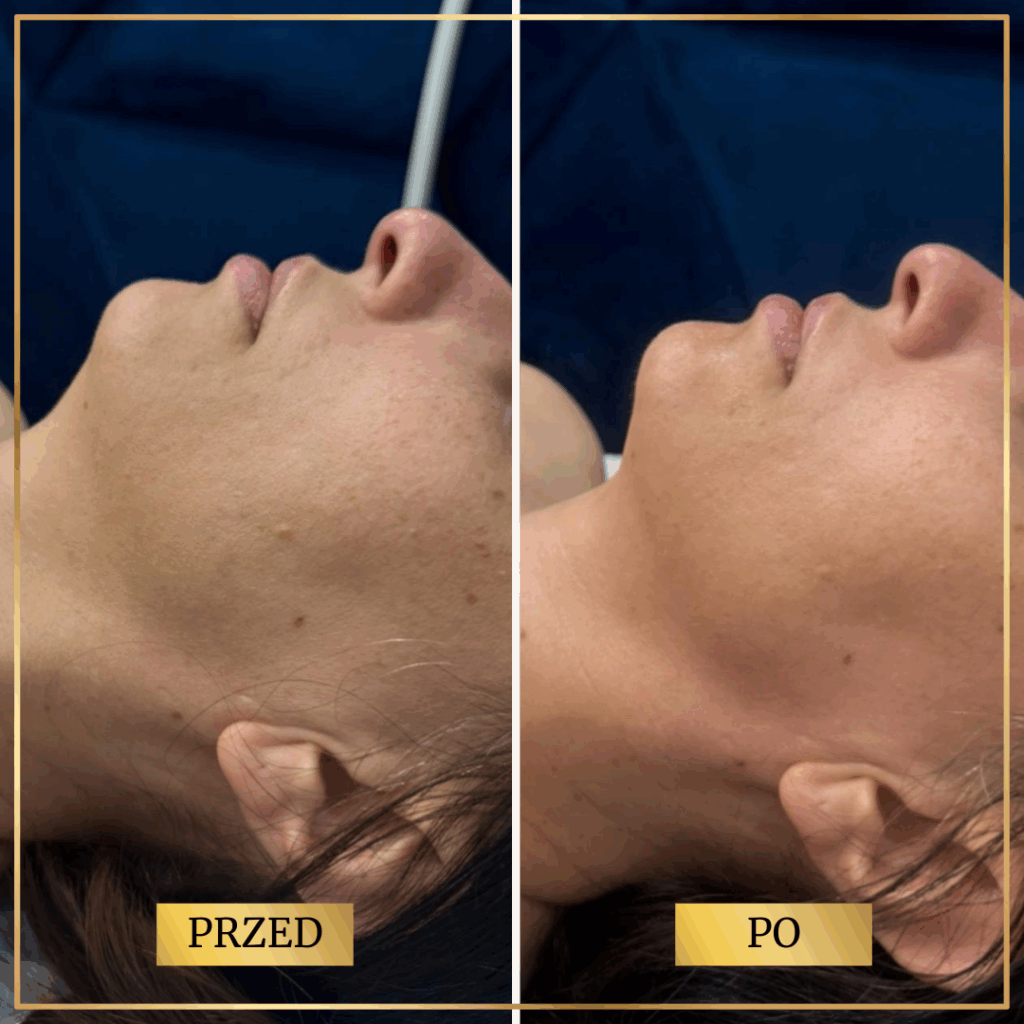 Skóra staje się wyraźnie napięta, gładsza i bardziej jędrna — widoczna poprawa owalu twarzy bez igieł i podrażnień.